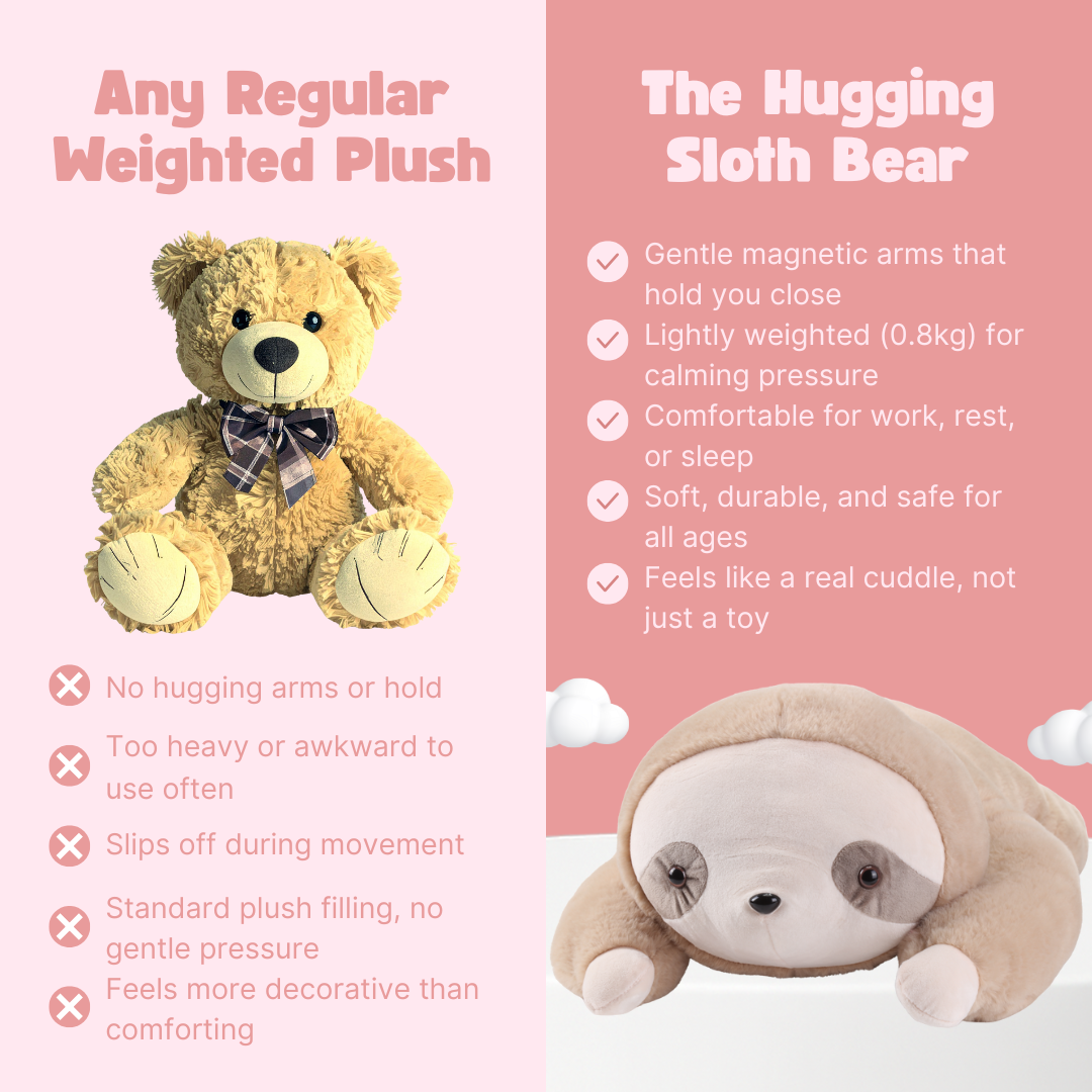 The Hugging Sloth Bear is designed for everyone - from kids who need comfort at bedtime to adults looking for stress relief after long days. For children under 3, supervision is recommended due to small enclosed magnets.